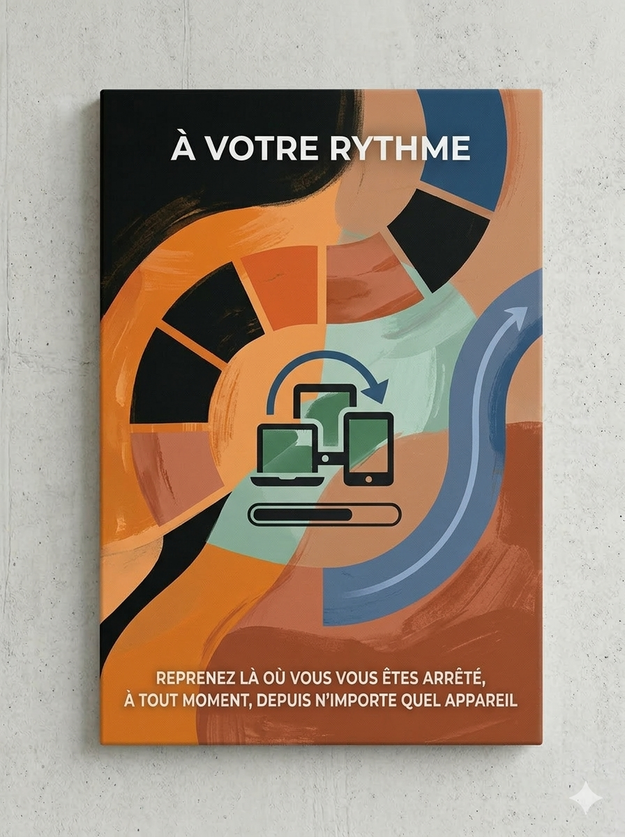 Reprenez là où vous vous êtes arrêté, à tout moment, depuis n'importe quel appareil. Des formations adaptées à votre rythme, 100% en ligne.